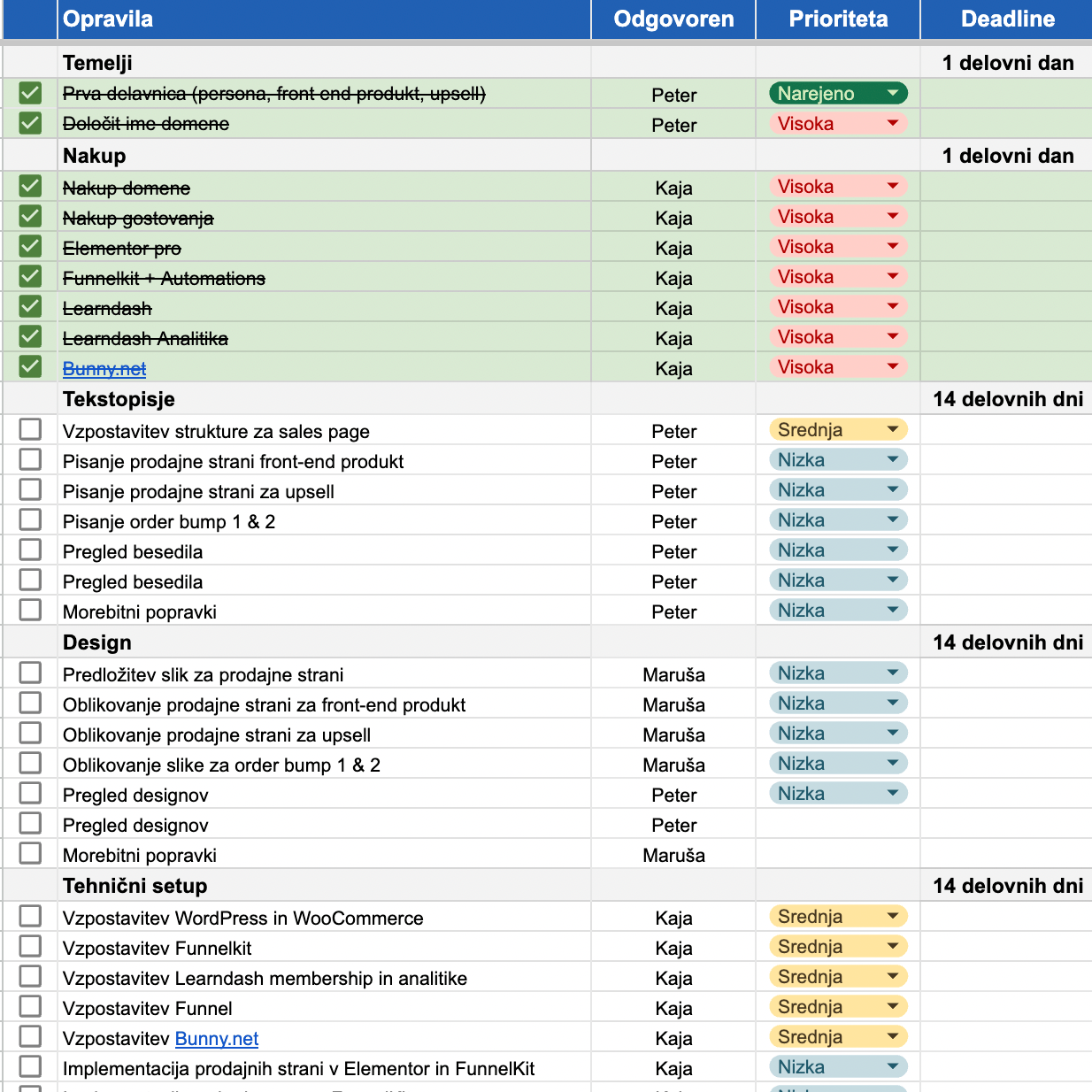 Vsak korak ima določeno odgovorno osebo, jasno prioriteto in časovni okvir. S checklistami je napredek viden v realnem času, fokus pa ostaja na stvareh, ki premikajo projekt naprej.